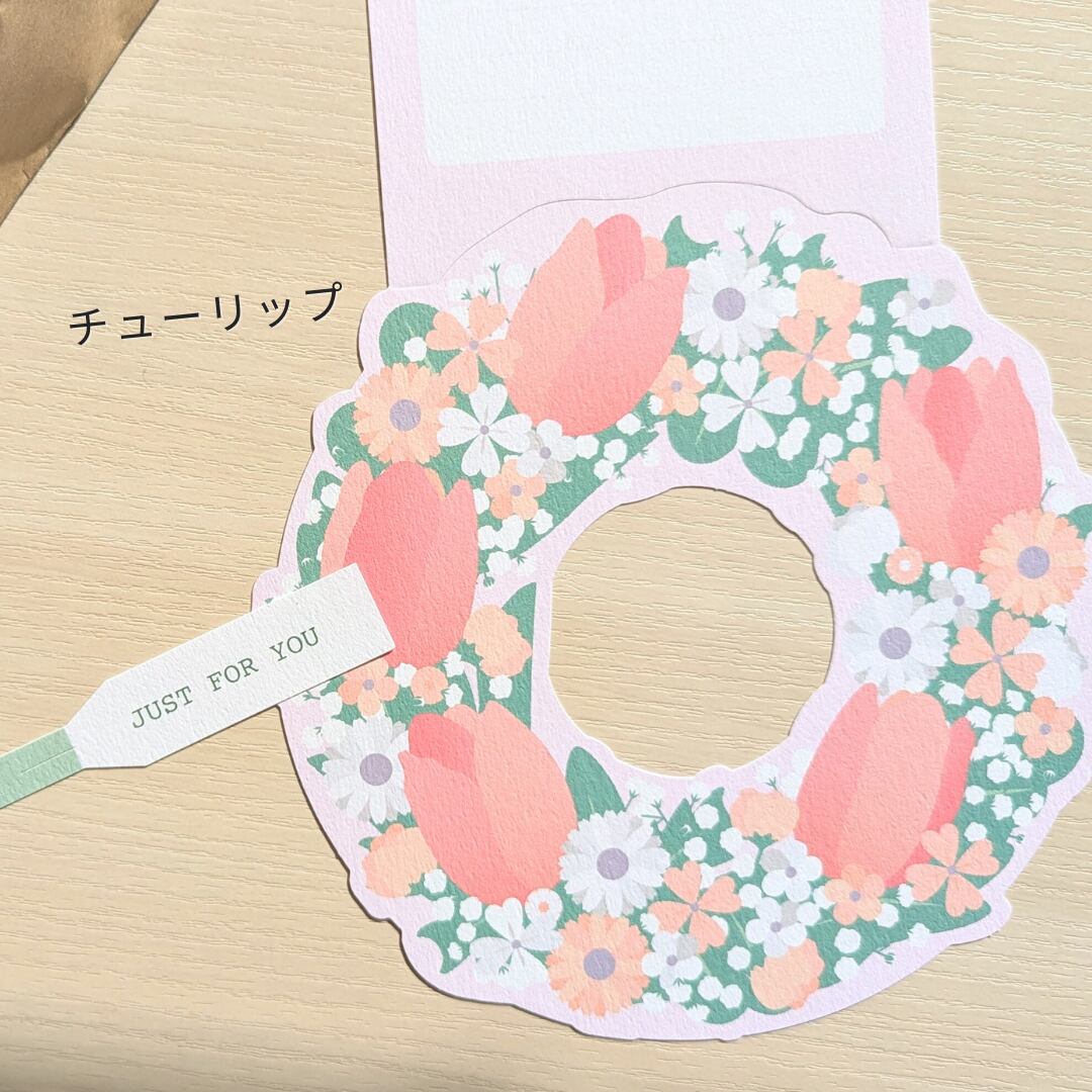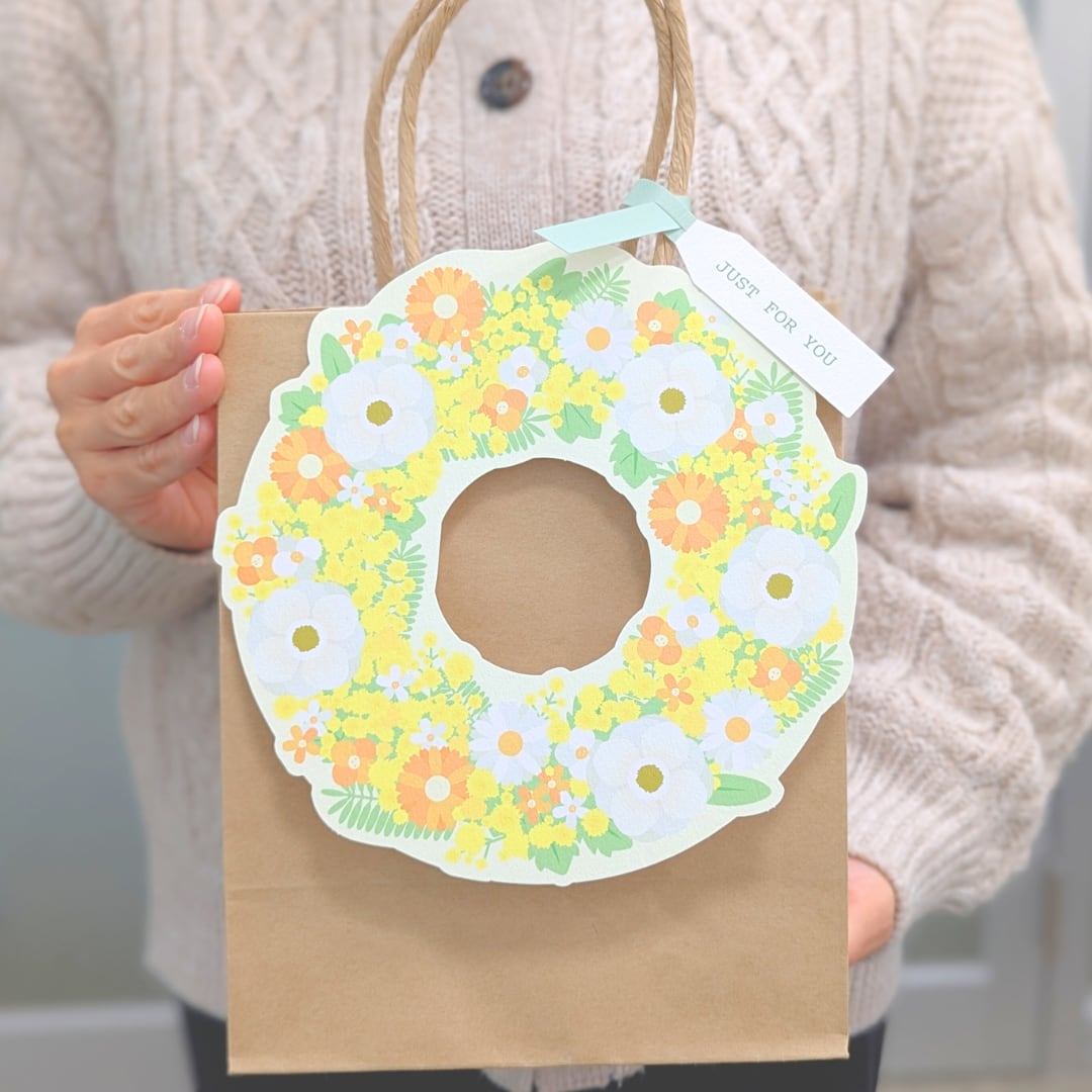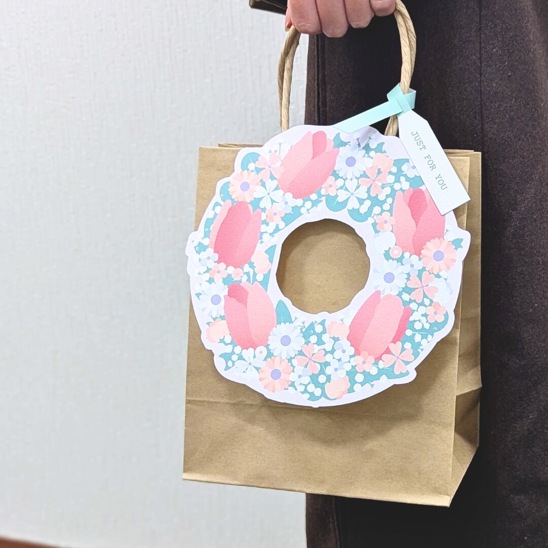 リースカードにメッセージを書き込み、紙袋の持ち手にセットすると、華やかなラッピングバッグに!お花とともにキモチを贈るラッピングセットです。