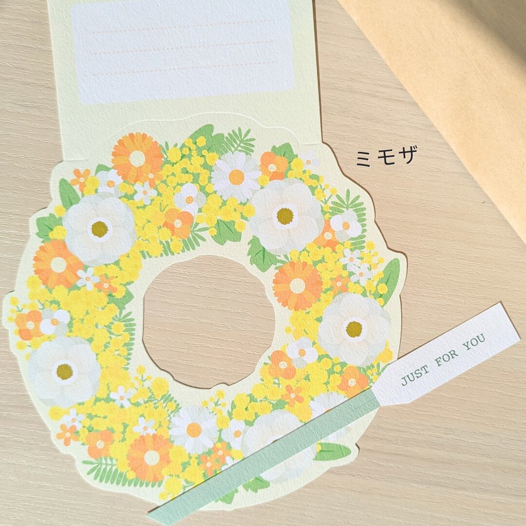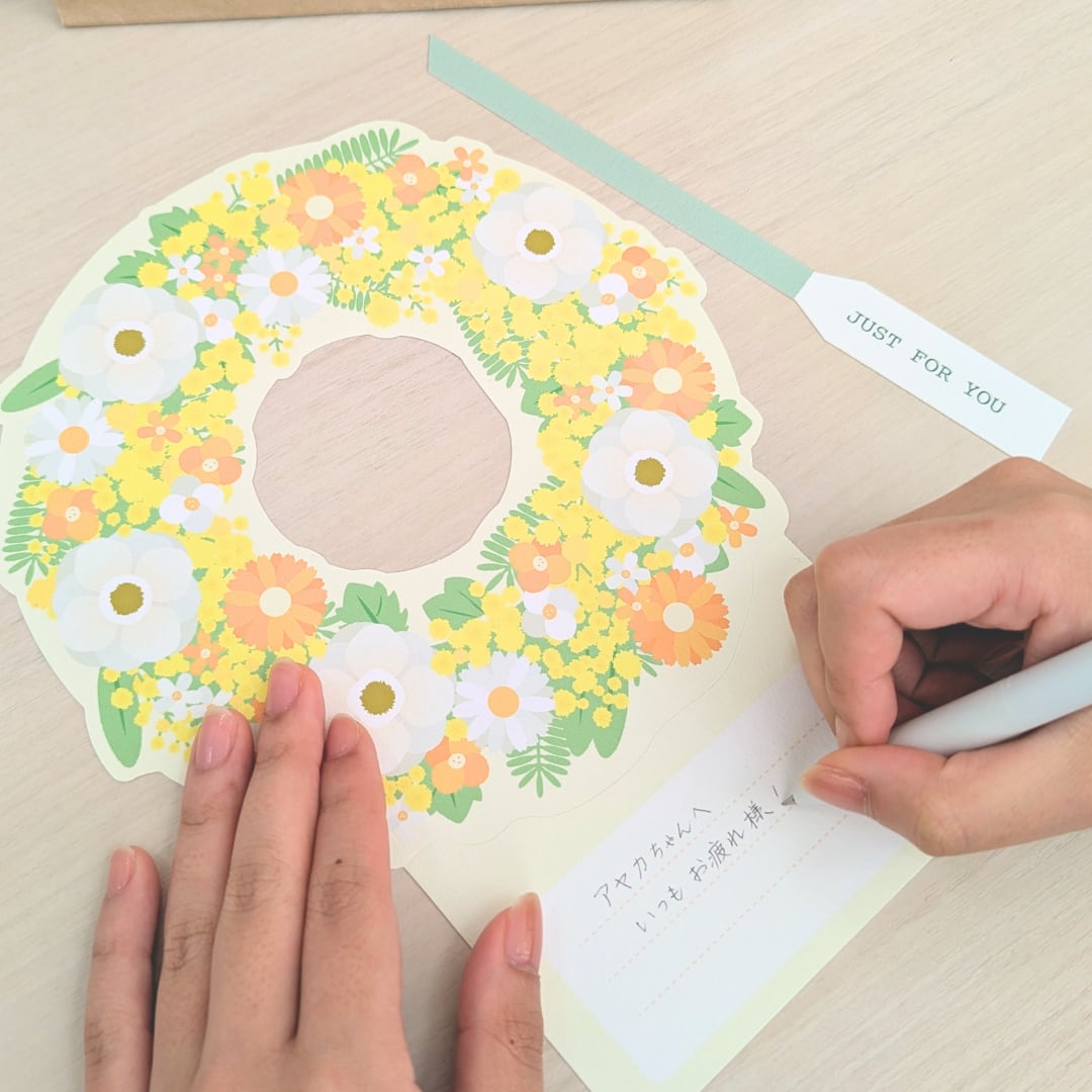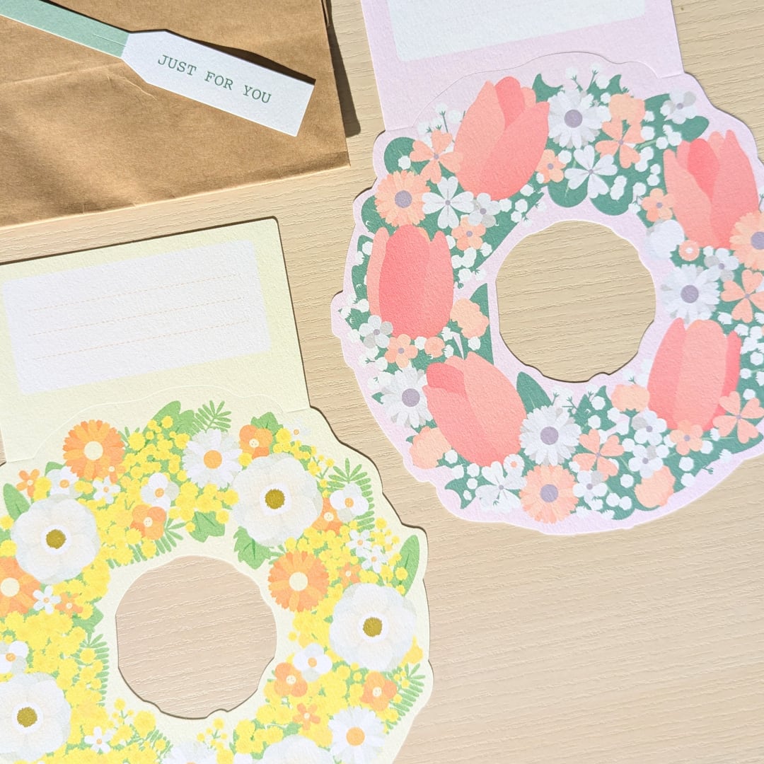 リースカードにメッセージを書き込み、紙袋の持ち手にセットすると、華やかなラッピングバッグに!お花とともにキモチを贈るラッピングセットです。